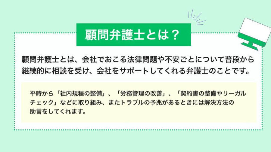 顧問弁護士は、法的な問題を解決するための重要な存在です。主に以下の役割を果たします。