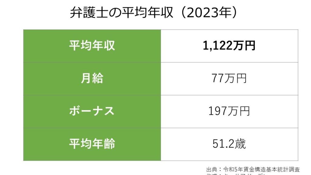日本での弁護士の平均年収は約600万円から900万円である。具体的な数字は以下のように分かれる。