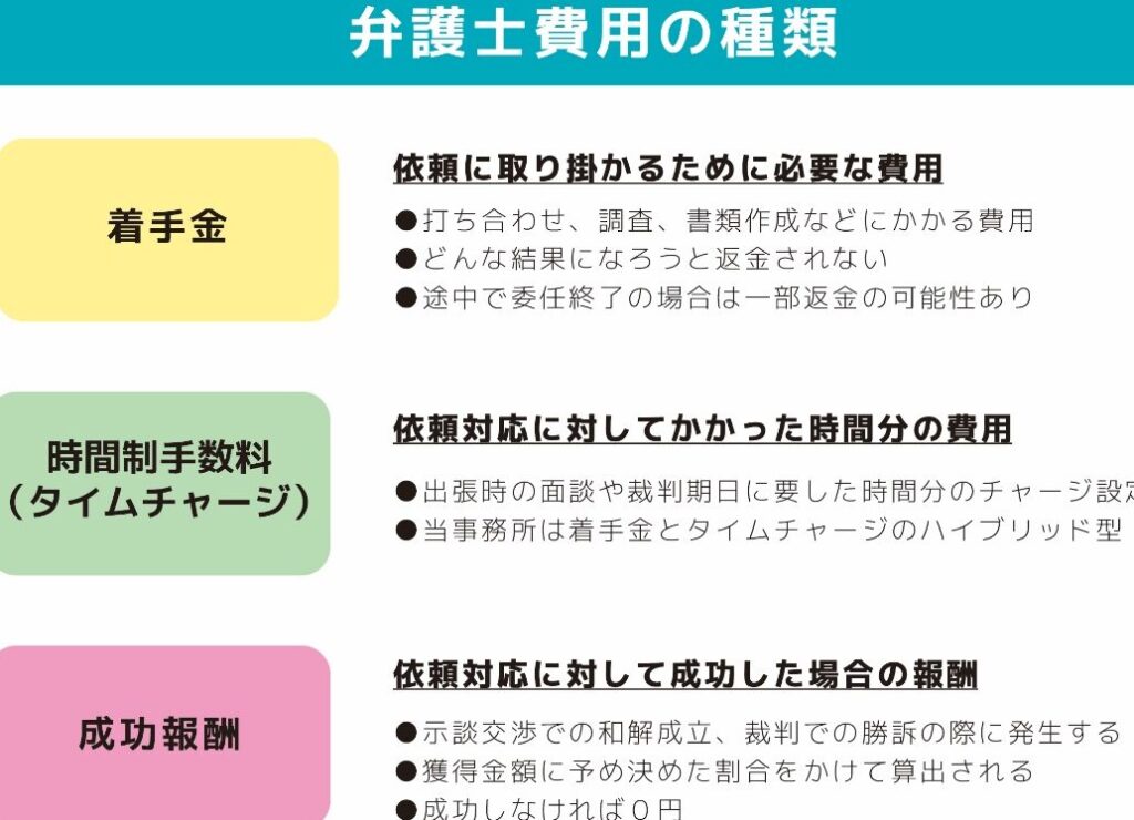 弁護士費用には、成功報酬以外にも考慮すべき費用がいくつかある。それらの主な費用は以下の通りだ。